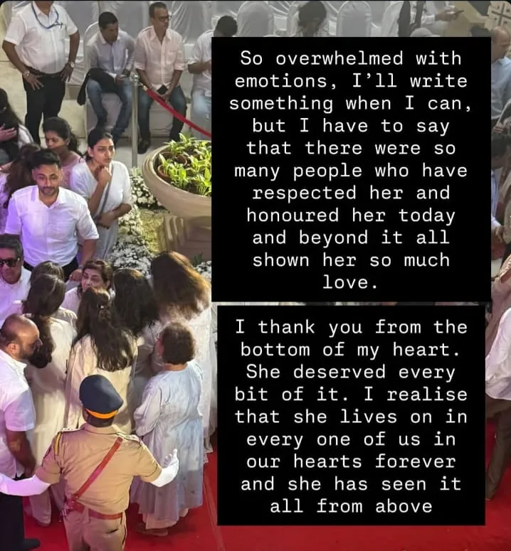 जनाई ने इंस्टाग्राम स्टोरी में लिखा, “जब मैं खुद को संभाल लूंगी तो विस्तार से लिखूंगी, लेकिन अभी के लिए, मैं यह कहना चाहती हूं कि मैं उस सम्मान और प्यार के लिए बहुत आभारी हूं जिसके साथ अनगिनत लोग उन्हें आज और आगे भी याद करते हैं. मैं दिल से आपका शुक्रिया अदा करती हूं. वह इसकी हकदार थीं. मुझे एहसास है कि वह हम सबके दिलों में हमेशा जिंदा रहेंगी और उन्होंने यह सब ऊपर से देखा होगा. इसके अलावा, जनाई ने दादी के साथ फोटो शेयर करते हुए लिखा, “अलविदा, मेरे प्यार.”