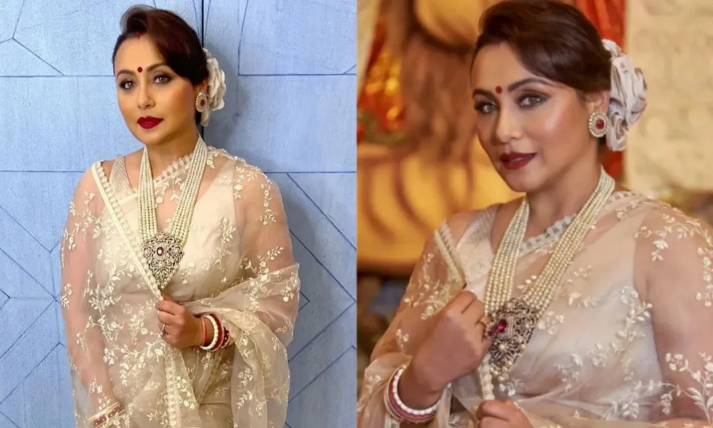 साल 2022 में जब रानी मुखर्जी ने ये साड़ी पहनी थी, तब उन्होंने इसे पर्ल नेकलेस, रूबी ईयररिंग्स, लाल बिंदी और जूड़े में सजे फूलों के साथ एक ट्रेडिशनल तरीके से स्टाइल किया था. हालांकि, इस बार रानी ने ‘मिनिमलिज्म’ का रास्ता चुना. उन्होंने हैवी हार की जगह एक स्लिम नेकलेस और कान में बड़े डायमंड ईयररिंग्स पहने. मशहूर मेकअप आर्टिस्ट मिकी कॉन्ट्रैक्टर ने रानी की आंखों को स्मोकी लुक दिया और लिप्स पर न्यूड लिपस्टिक का यूज़ किया. बालों को एक्ट्रेस ने सॉफ्ट वेव्स में खुला छोड़ा, जिससे उनका पूरा लुक बहुत मॉर्डन और ग्रेसफुल लग रहा था.