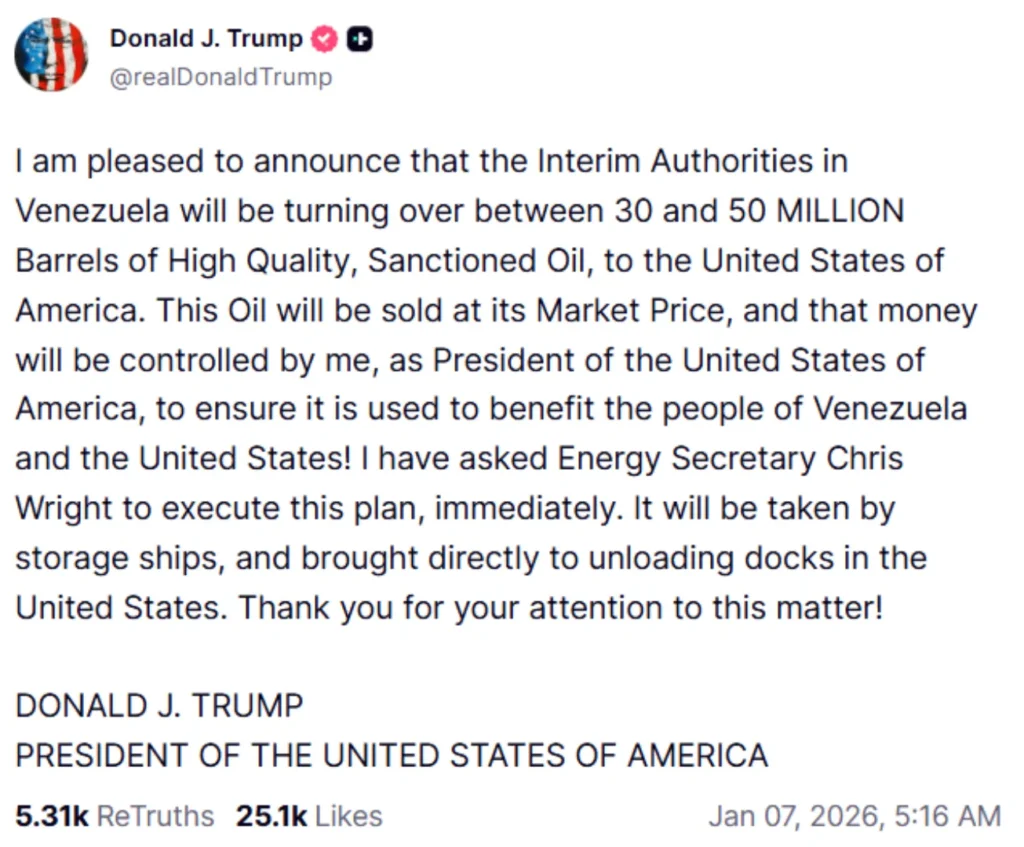 ट्रंप ने ट्रूथ पर लिखा, ‘मुझे यह घोषणा करते हुए खुशी हो रही है कि वेनेजुएला के अंतरिम अधिकारी अमेरिका को 30 से 50 मिलियन बैरल हाई क्वालिटी तेल सौंपेंगे. यह तेल मार्केट प्राइस पर बेचा जाएगा और उस पैसे को मैं, अमेरिका के राष्ट्रपति के तौर पर कंट्रोल करूंगा, ताकि यह पक्का हो सके कि इसका इस्तेमाल वेनेजुएला और अमेरिका के लोगों के फायदे के लिए किया जाए! मैंने एनर्जी सेक्रेटरी क्रिस राइट से इस प्लान को तुरंत लागू करने के लिए कहा है. इसे स्टोरेज जहाजों से ले जाया जाएगा और सीधे अमेरिका में अनलोडिंग डॉक पर लाया जाएगा. बताा दें, व्हाइट हाउस शुक्रवार को वेनेजुएला के संबंध में तेल कंपनी के अधिकारियों के साथ ओवल ऑफिस में एक बैठक आयोजित कर रहा है, जिसमें एक्सॉन, शेवरॉन और कोनोकोफिलिप्स के प्रतिनिधियों के शामिल होने की उम्मीद है.