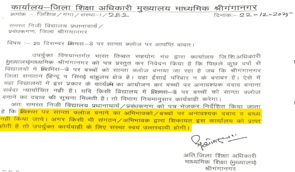 बता दें भारत-तिब्बत सहयोग मंच द्वारा ज़िला शिक्षा अधिकारियों को एक ज्ञापन सौंपा था, जिसके बाद शिक्षा विभाग ने यह आदेश जारी किया. ज्ञापन में आरोप लगाया गया है कि हाल के सालों में कुछ स्कूल बच्चों को सांता क्लॉज़ के कपड़े पहनने के लिए मजबूर कर रहे हैं, जिससे माता-पिता में नाराजगी है. संगठन ने कहा कि श्रीगंगानगर मुख्य रूप से हिंदू-सिख बहुल इलाका है और किसी खास परंपरा को थोपा नहीं जाना चाहिए.