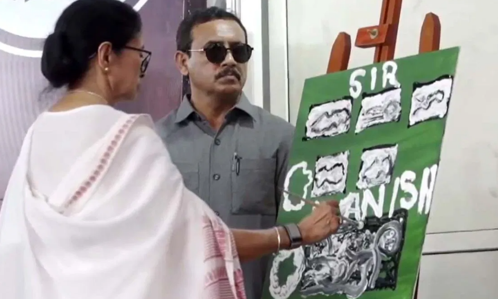 पश्चिम बंगाल समाचार: पश्चिम बंगाल की मुख्यमंत्री ममता बनर्जी का SIR के खिलाफ पांचवें दिन भी प्रदर्शन जारी है. SIR के खिलाफ जारी आंदोलन के पांचवें दिन उन्होंने चुनाव आयोग पर काफी रचनात्मक तरीके से हमला बोला. उन्होंने वोटर लिस्ट से कथित तौर पर नाम न हटाने को लेकर एक बोर्ड पर SIR और उसके बाद ‘गायब’ लिखा. इसके बाद उन्होंने इस मिटा दिया. सेंट्रल कोलकाता में मेट्रो चैनल पर धरना स्टेज पर सीएम ममता एक स्टैंड पर रखे हरे बोर्ड पर रंगों से ड्राइंग बनाती दिखीं. ड्राइंग बोर्ड के ऊपर उन्होंने पहले SIR लिखा, जबकि नीचे उन्होंने सफेद रंग से ‘गायब’ शब्द लिखा.