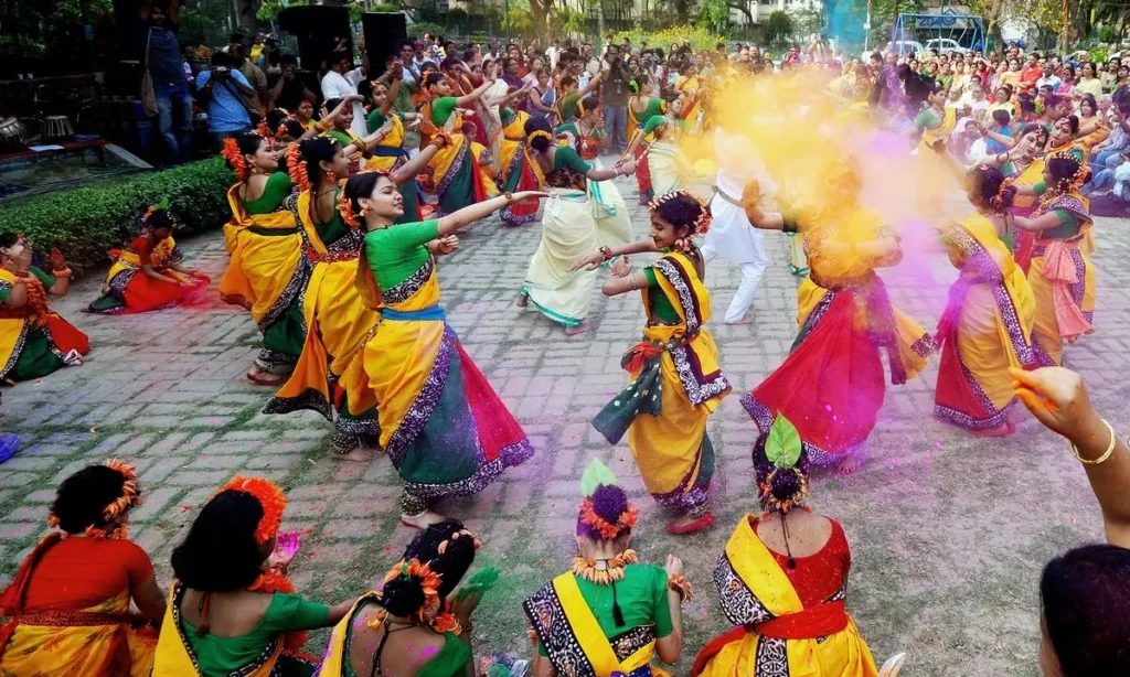 पश्चिम बंगाल का शांतिनिकेतन हर चीज़ को बाकी दुनिया से थोड़ा अलग ढंग से करने के लिए जाना जाता है और होली का भी यही हाल है. महान कवि रवींद्रनाथ टैगोर ने रंगों के इस त्योहार को ‘बसंत उत्सव’ का नाम दिया था. उनके लिए होली सिर्फ हुड़दंग नहीं, बल्कि नेचर के लिए नए जन्म, वसंत की हरियाली और क्रिएटिविटी का सेलिब्रेशन था. शांतिनिकेतन में होली का नजारा किसी कैनवस पर बनाई गई पेंटिंग जैसा होता है. यहां विश्व भारती विश्वविद्यालय के स्टूडेंट्स और लोकल लोग ट्रेडिशनल पीले रंग के कपड़े पहनते हैं. लड़के पीले कुर्ते और लड़कियां बसंती रंग की साड़ियां पहनती हैं. साथ ही वो अपने बालों में ताजे पलाश के फूल भी सजाती हैं. होली सेलिब्रेशन की शुरुआत ‘रवींद्र म्यूजिक’ के साथ होती है, ये गीत टैगोर ने खास तौर पर वसंत के लिए लिखे थे. यहां का डांस बॉलीवुड के शोर-शराबे वाला नहीं, बल्कि बहुत सिंपल होता है.