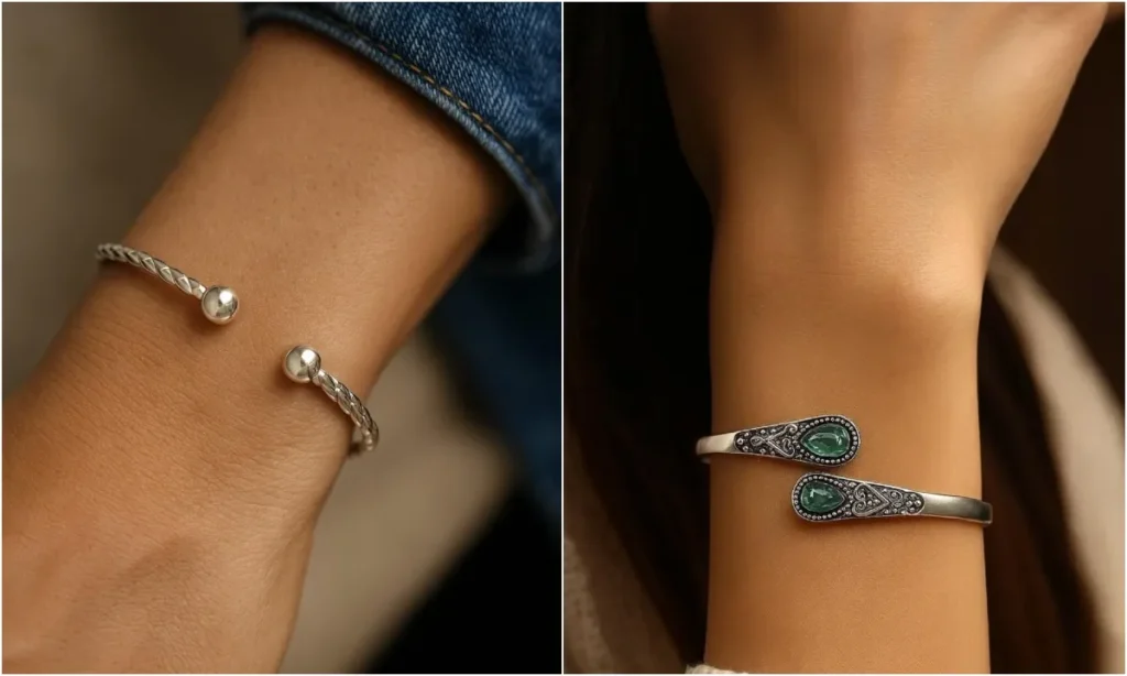 ओपन या कफ स्टाइल सिल्वर बैंगल्स आजकल काफी ट्रेंड में हैं. इन्हें पहनना आसान होता है और ये वेस्टर्न आउटफिट्स के साथ भी बहुत अच्छी लगती हैं. जींस, टॉप या ड्रेसेस के साथ ये आपको स्मार्ट और कॉन्फिडेंट लुक देती हैं.