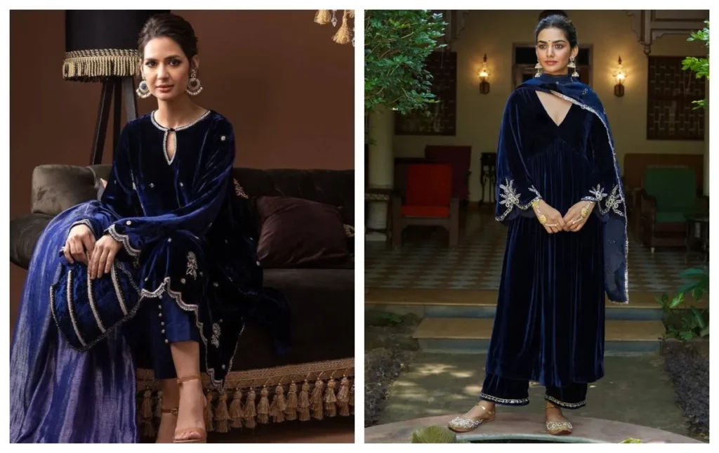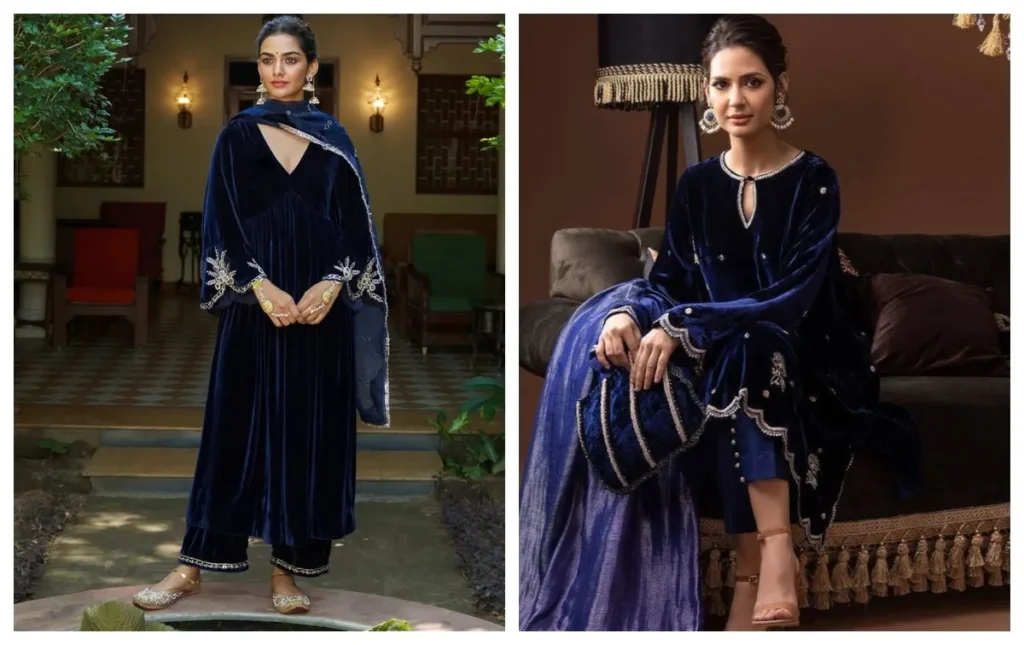 Blue colored velvet suit is the safest and royal option. Blue color looks good on every skin tone and looks very attractive especially in night functions. You can style it with minimal accessories and makeup.