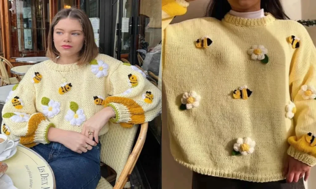 You will feel very fresh and energetic in this yellow sweater with bee and flower pattern. The hand-woven bee and flower design is so unique that everyone will definitely ask you where you got it from. This sweater will give you a spring feel even in winter.