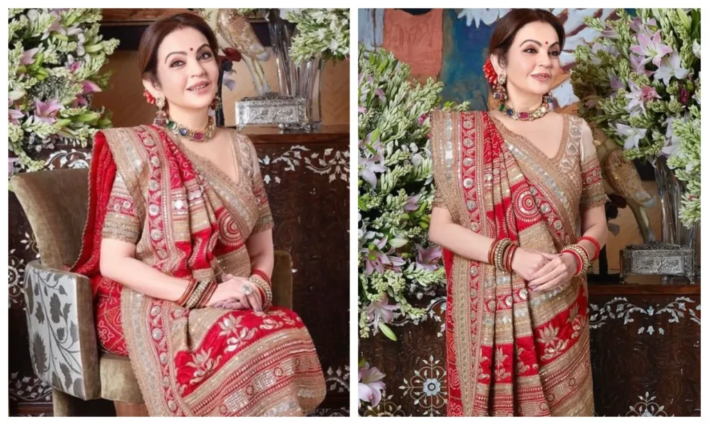 Neeta Ambani won everyone’s heart in the classic Gujarati Gharchola saree. Designer Anuradha lawyer’s saree was adorned with Gold Embroidery and embellished patterns. He styled it with traditional neckpiece, earrings and bangles. Light makeup, red bindi and red flowers adorned with red flowers gave a royal touch to her look. If you want a little simple but elegant look, then Nita’s Sinduri Red Jamdani Banarasi silk saree look will be perfect for you.
