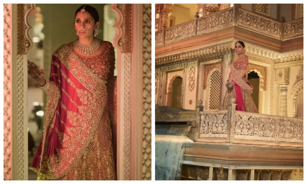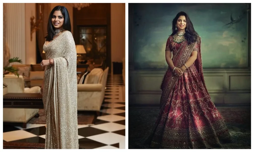 If you want to offer something different from the red color on this Karva Chauth, then take a look at the sequin Sabyasachi saree of Isha Ambani. This saree is a combo of both aligns and glamor. You can style it with crystal jewelery, vermilion and satal makeup. Apart from this, his Marun Velvet Sabyasachi lehenga is also a royal choice. This outfit decorated with silver zari, and pressed work is the perfect mix of both traditional and luxury.