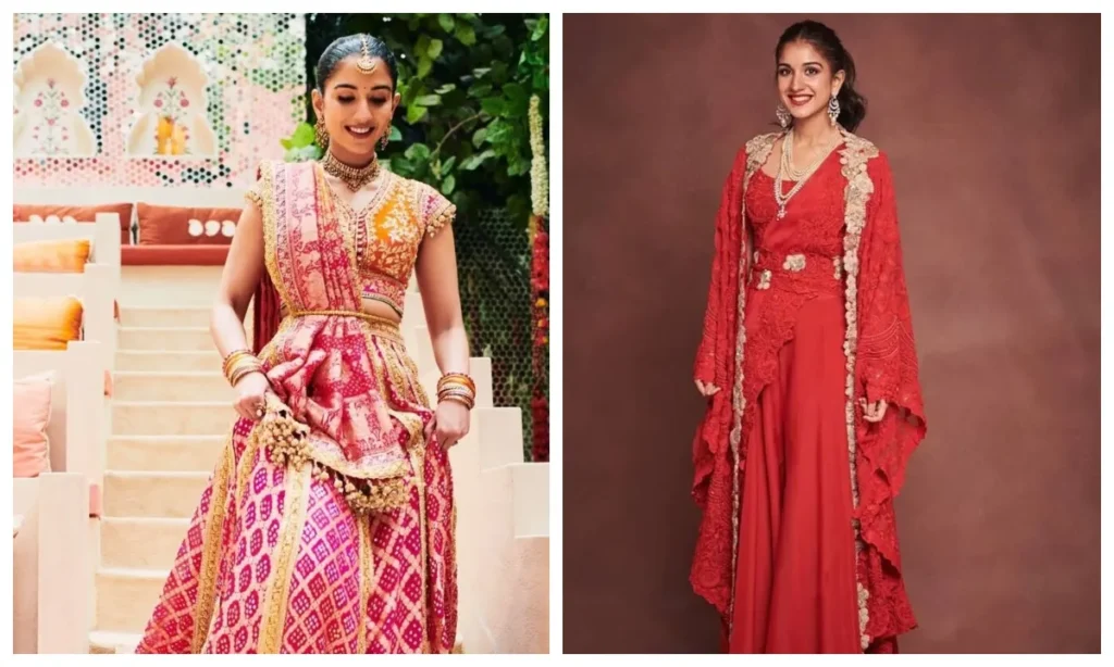 Shloka Mehta showed that your wedding lehenga can be worn again in the festive season instead of being locked in the cupboard. He gave a new twist by giving pink tone to his red bridal lehenga. This look was both traditional and sustainable. He styled the lehenga with statement necklace, mehndi and bread hairstyle. He is also perfect for another Red-Green Embroidard Lehenga with Bandhani Dupatta. The peak adorned with Gajre and Kundan Jelary further enhanced his look.