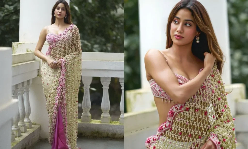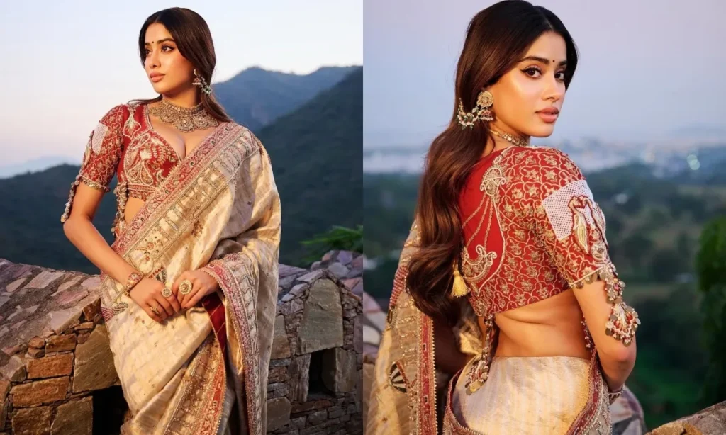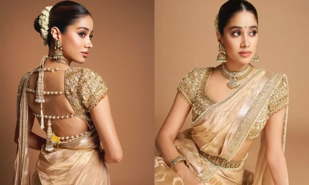 जान्हवी कपूर के सबसे यादगार साड़ी लुक्स में से एक है ये ऑर्गेंजा लुक. क्रीम कलर की ऑर्गेंजा साड़ी में वो किसी अप्सरा से कम नहीं लग रही हैं. बालों में गजरा, परफेक्ट स्टेटमेंट जूलरी और लाइट मेकअप के साथ जान्हवी ने इस साड़ी लुक को कम्पलीट किया.