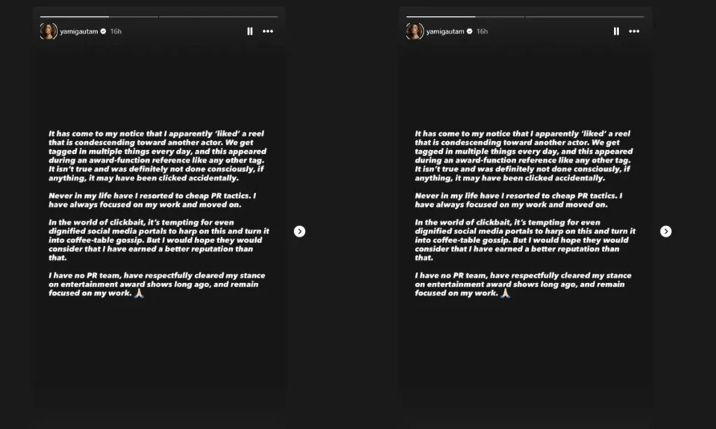 कंट्रोवर्सी बढ़ती देख यामी गौतम ने सोशल मीडिया प्लेटफॉर्म पर अपनी बात रखी. उन्होंने क्लियर किया कि ये लाइक जानबूझकर नहीं किया गया था. यामी ने लिखा कि सेलिब्रिटीज को हर दिन सैकड़ों पोस्ट में टैग किया जाता है. उन्होंने लिखा कि, मुझे पता चला है कि मैंने एक ऐसी रील लाइक की है जो किसी दूसरे एक्टर के लिए अपमानजनक है. हमें हर दिन कई चीजों में टैग किया जाता है. ये भी किसी अवॉर्ड फंक्शन के टैग की तरह ही सामने आया था. ये सच नहीं है और ना ही जानबूझकर किया गया था. ये सिर्फ गलती से हुआ एक क्लिक हो सकता है.