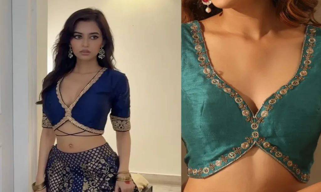 This deep V neck blouse design looks very simple and classy. If you do not like blouses with high cutting then you can also get such blouses made. If you want, you can add a string at the bottom, this will make it look even more special or you can wear it without the string. This will give you a glamorous look.