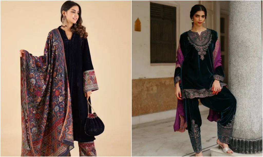 Velvet suit means the superstar of winter fashion. Velvet suit made in dark color gives you a very glamorous look. A dupatta with gota or zari work makes the style even richer with such a suit. This suit is the best choice for weddings and festive events.