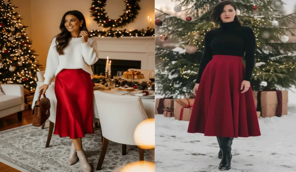 Red skirt with sweater is a very classy and easy outfit for Christmas party. You can pair a red skirt with a black or white sweater. With this you can complete the look by wearing a red purse and boots. This outfit is very classy and comfortable.