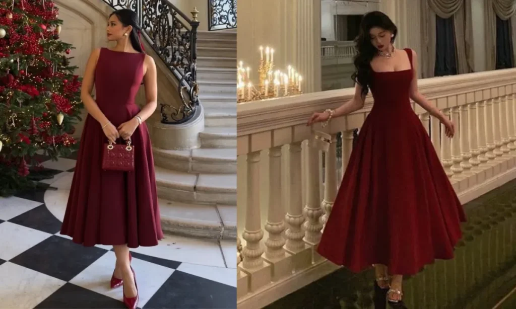 This type of red frock will give you a rich and classy look. You will feel like a princess wearing this. Its flare looks very nice, which will make your aesthetic photos more beautiful. You should wear heeled boots or pencil heels with it. This dress will give a very cute look.